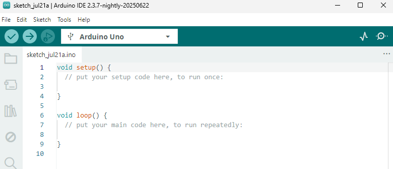 - Setelah terinstall buka software arduinonya untuk memulai memprogram, pada titik ini dapat dilihat ada dua baris program yang menjadi bawaan setiap membuat sketch baru. Untuk “void setup()” akan dieksekusi sekali dan “void loop()” akan dieksekusi terus menerus.