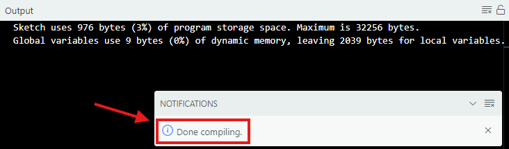 - Jika sudah muncul notifikasi seperti ini artinya program kalian sudah selesai tanpa kesalahan maka bisa dilanjutkan ke tahap Upload program ke arduino. Upload program bisa dengan cara mengklik tombol Upload disebelah tombol Verify.