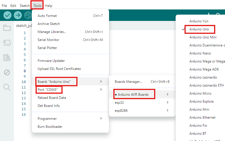 - Perlu diingat setiap kali ingin memprogram ubah dulu port dan boardnya sesuai dengan yang kalian gunakan untuk berubahnya bisa dengan mengkllk Tools > Board > Arduino AVR Board > lalu pilih board yang kalian gunakan begitu pula dengan port. Pada bagian port bisa berbeda beda pada setiap perangkat untuk melihat kita terhubung diport berapa bisa dilihat di device manager pada bagian ports