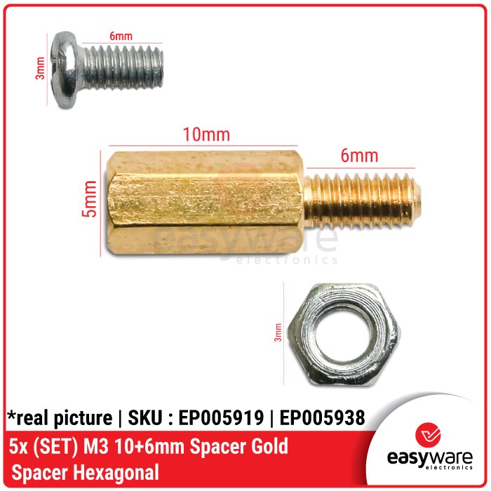 5pcs SET Spacer M3 10+6mm Gold Hex adalah pilihan favorit para maker karena sudah all-in-one (sudah termasuk baut dan mur). Jadi, kamu nggak perlu lagi pusing nyari baut M3 yang cocok secara terpisah.