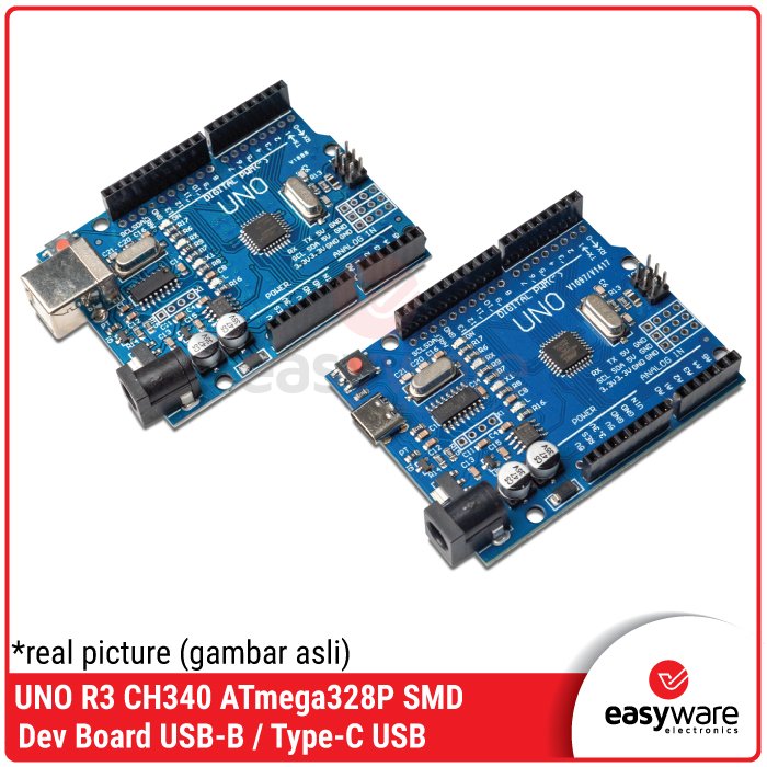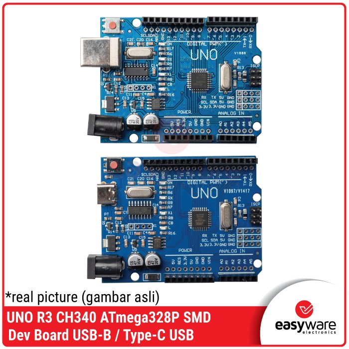 Kedua board ini menggunakan chip utama ATmega328P (versi SMD) yang tangguh dan chip komunikasi CH340 yang stabil. Perbedaan utamanya ada pada jenis port USB-nya: