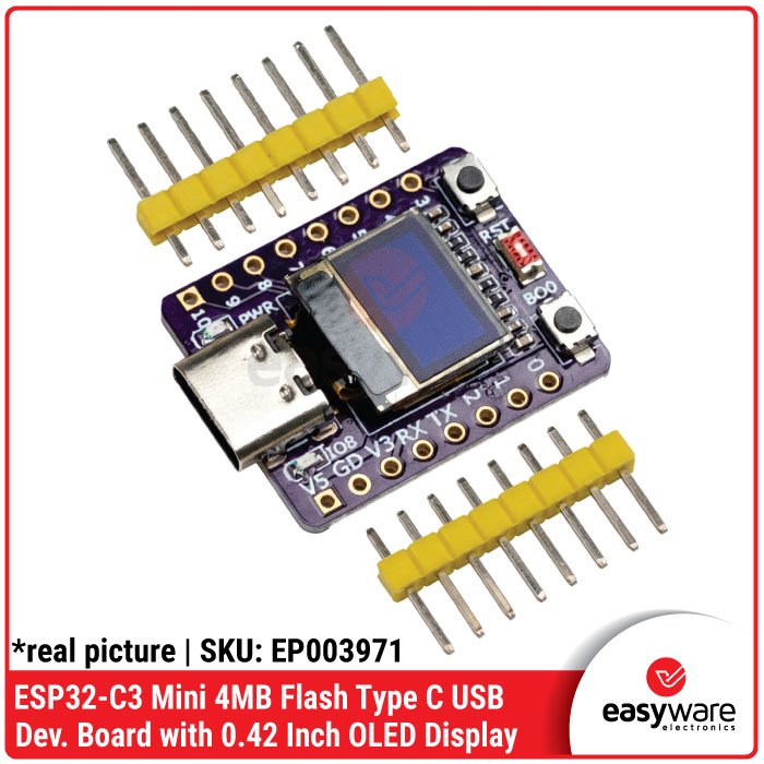 Fitur Utama: Chip ESP32-C3, WiFi, Bluetooth, dan Layar OLED I2C terintegrasi.