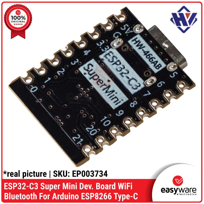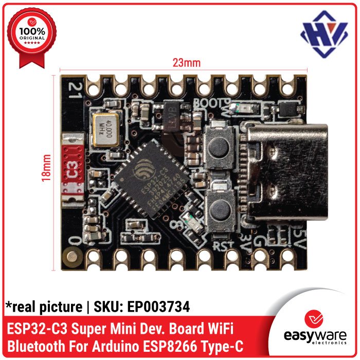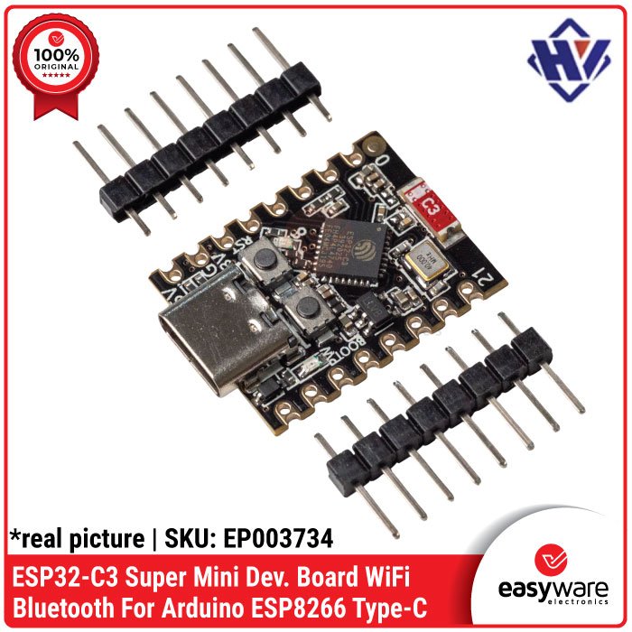 Fitur Utama: Chip ESP32-C3 yang mendukung WiFi dan Bluetooth.