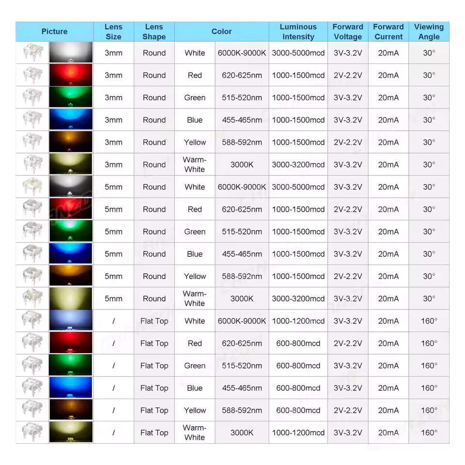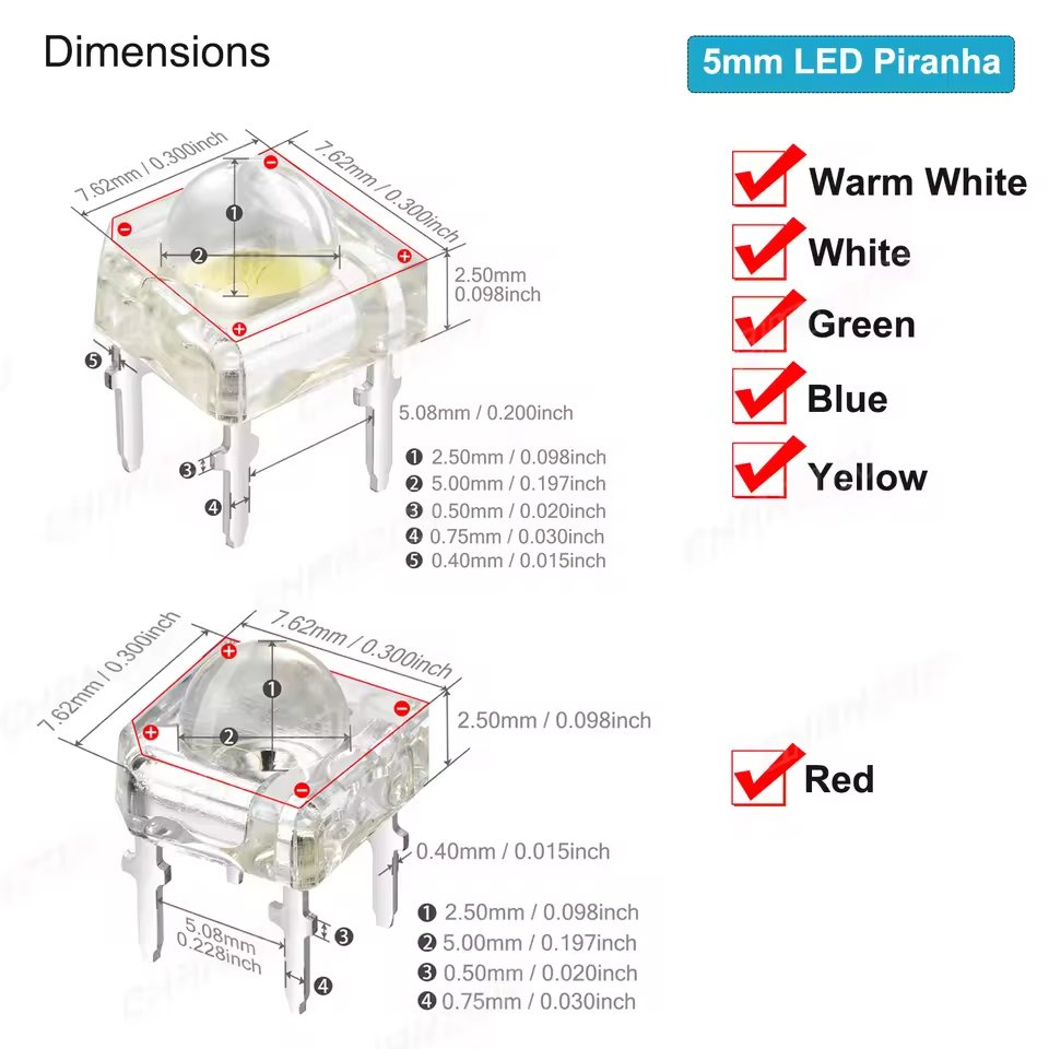 - 📏 Ukuran 5mm Piranha: Bentuk kotak dengan lensa bundar yang ikonik, ideal untuk pemasangan through-hole.