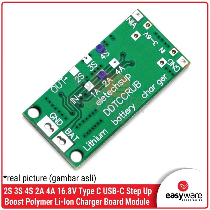 Gak perlu pusing lagi cari adaptor khusus, cukup colok pakai kabel USB-C HP atau laptop kamu. Modul ini support 2S, 3S, bahkan 4S baterai LiPo/Li-Ion dengan output charging hingga 16.8V dan pilihan arus 1A, 2A, atau 4A.