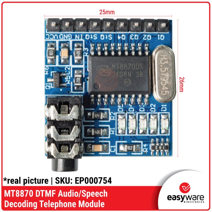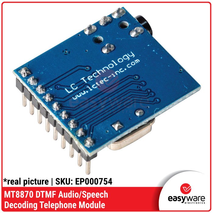 Setiap kali tombol angka (0-9, *, #, A-D) pada ponsel ditekan, ia menghasilkan campuran dua frekuensi unik. IC MT8870 pada modul ini akan memfilter, menghitung, dan mengubah suara tersebut menjadi kode biner. Kamu cukup menghubungkan audio jack ponsel ke modul ini, dan setiap tekanan tombol di ponsel akan menjadi perintah bagi sistemmu! ⚡