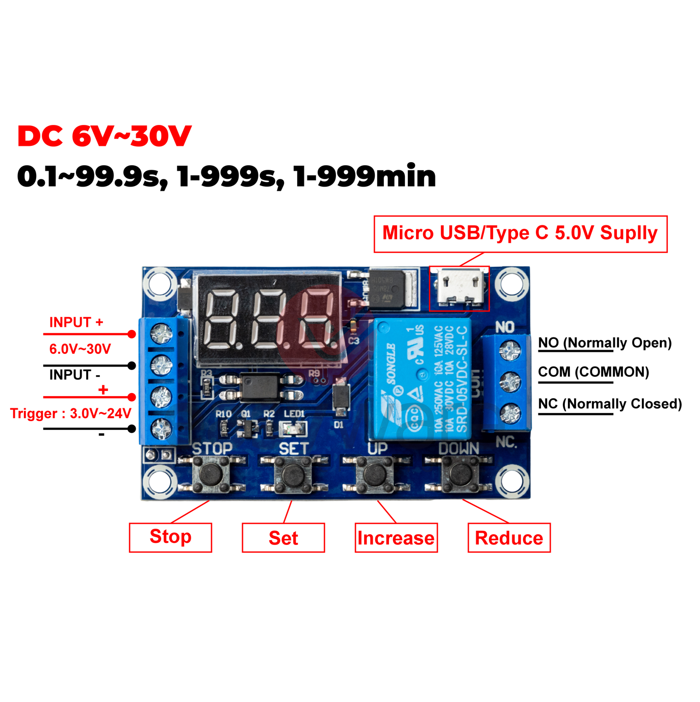 Modul Relay Delay Timer Digital 6-30V Cycle Looping – Micro USB / Type C Display LED