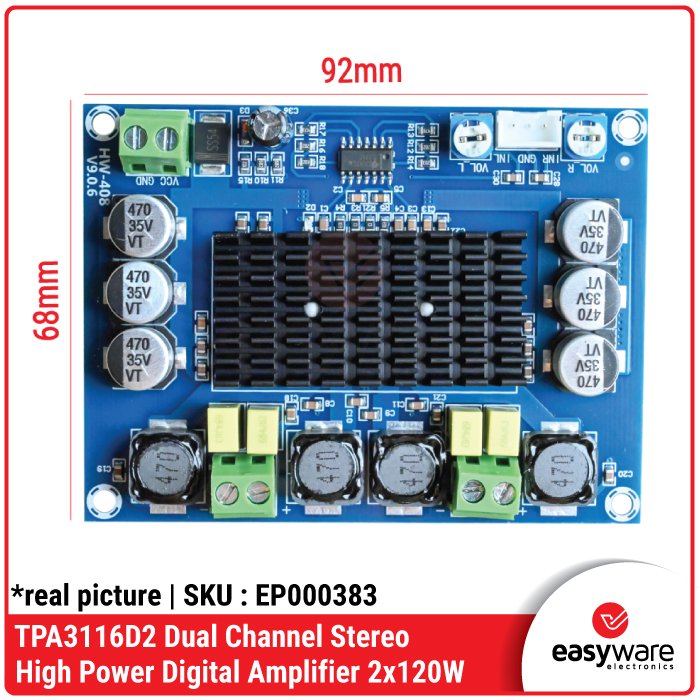 Lagi ingin membangun sistem audio yang punya tenaga besar dan sanggup menggetarkan ruangan? Kalau modul TPA3110 (30W) dirasa masih kurang, ini dia “kakak” besarnya: TPA3116D2 Dual Channel Stereo High Power Digital Amplifier 2x120W! Amplifier Class-D ini adalah salah satu yang paling bertenaga di kelasnya, siap memberikan performa audio tingkat tinggi dengan efisiensi yang luar biasa. 🚀